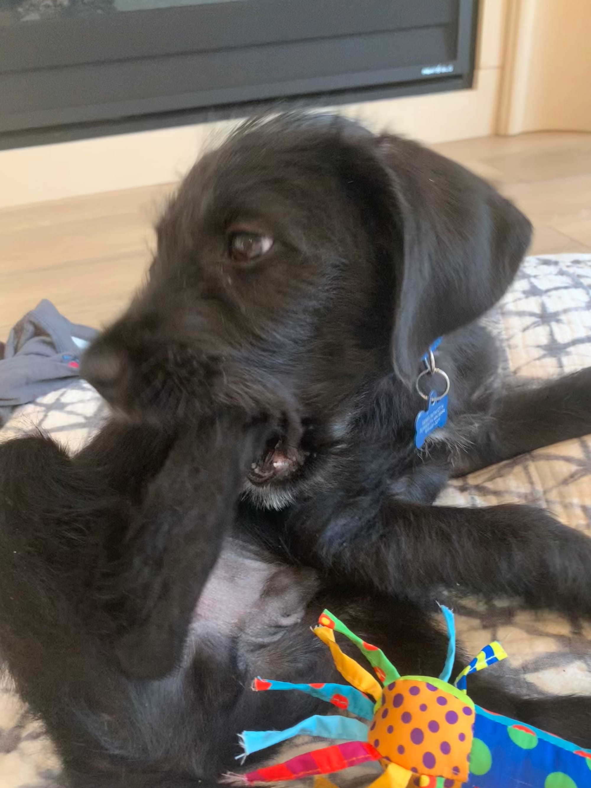 Ezra is 12.4 pounds and about 14 weeks old. Ezra loves the lick mat we got him. We soften his kibble and mix with a bit of fruit and then freeze it on the lick mat. Today's lick mat included frozen soften kibble and banana. He likes the feeling of the cold kibble and banana in his mouth because it makes his mouth feel better as his adult teeth are coming in and his baby teeth are falling out.